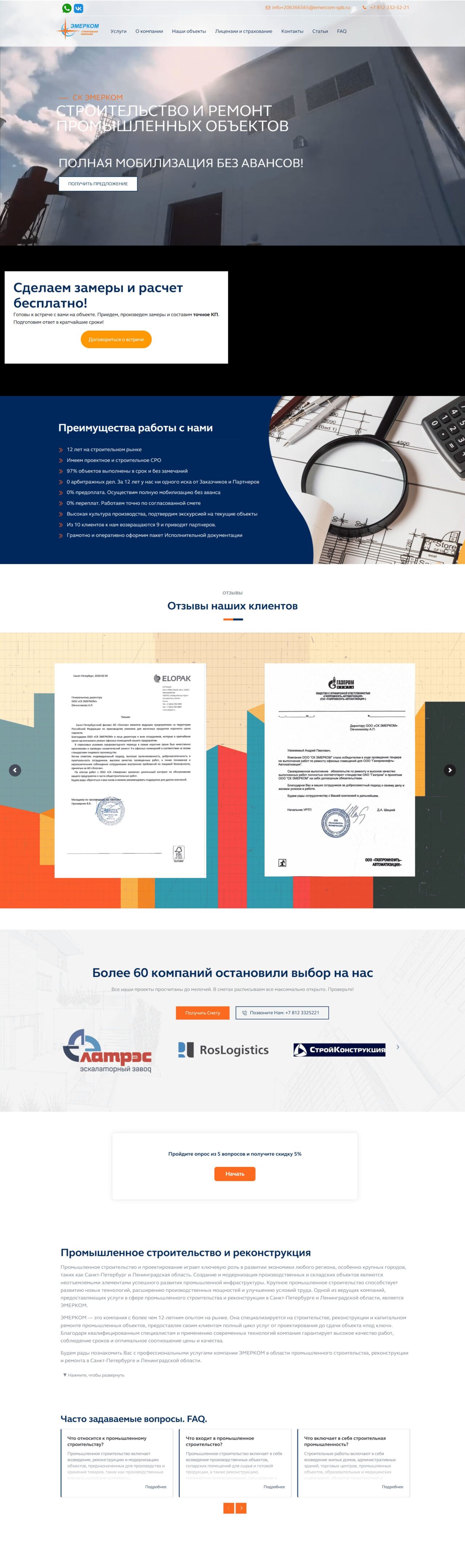 Создание веб-сайта для компании, оказывающей услуги в сфере строительства и ремонта производственных помещений, заводов, складов, кровли, фасадов, быстровозводимых зданий в Санкт-Петербурге и Ленинградской области.