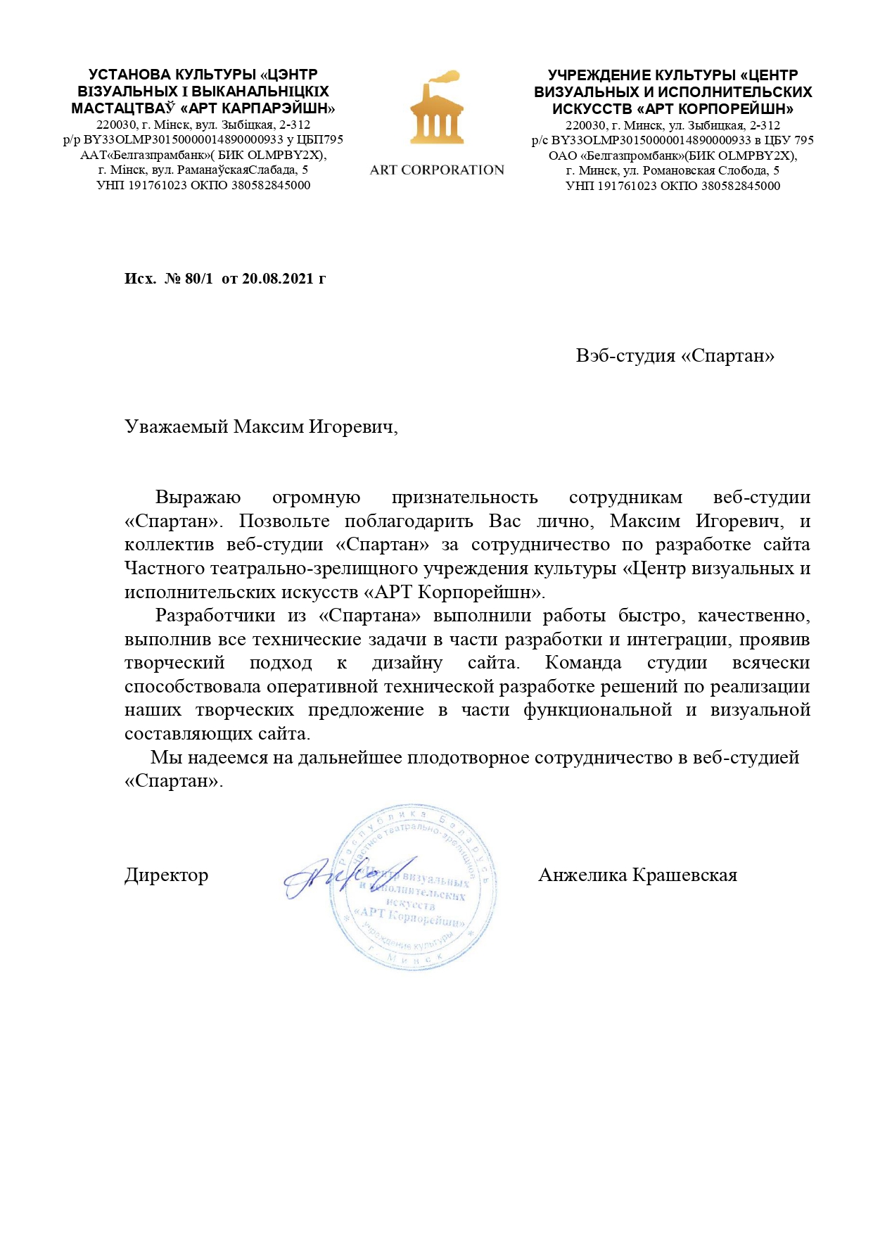 Выражаю огромную признательность сотрудникам веб-студии «Спартан». Позвольте поблагодарить Вас лично, Максим Игоревич, и коллектив веб-студии «Спартан» за сотрудничество по разработке сайта частного театрально-зрелищного учреждения культуры «Центр визуальных и исполнительских искусств «АРТ Корпорейшн».